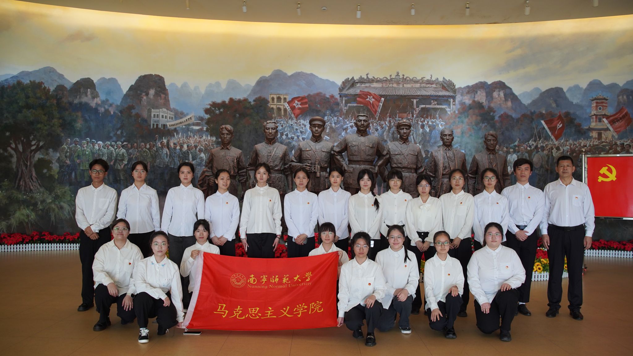 活动伊始,在庄严的国歌声中,全体人员肃立,向烈士纪念碑敬献鲜花,以表达对烈士们的崇高敬意和深切缅怀之情。随后,在讲解员的细致引导下,同学们逐一参观了新民主主义革命、土地革命、抗日战争、解放战争四个时期的广西革命史展厅。在讲解员生动的解说下,同学们仿佛穿越历史长河,亲身感受了广西军民在中国共产党的领导下,英勇奋战、不畏牺牲的壮丽历史画卷。