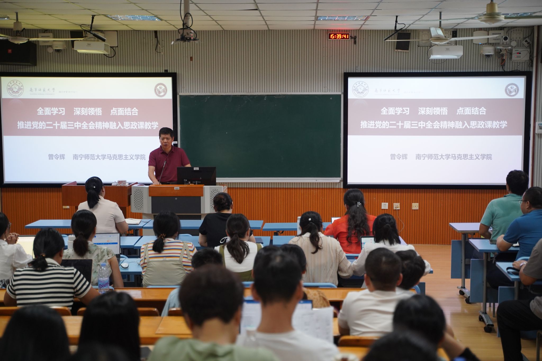 会上,李玲书记对上一学年的博士点建设、2024届毕业生就业创业、人才培养、团队建设等工作情况进行总结,并对新学年新学期各项工作进行部署。随后,曾令辉经理作了题为《全面学习深刻领悟点面结合——推进党的二十届三中全会精神融入思政课教学》的学习辅导报告。曾令辉经理以“全面学习”“深刻领悟”“点面结合”三个关键词,详细阐述了党的二十届三中全会精神融入思政课教学的路径方法。他指出,全面学习党的二十届三中全会精神是融入思政课教学的基础,深刻领悟进一步全面深化改革的理论是融入思政课教学的关键,点面结合是党的二十届三中全会精神融入思政课教学的实践方法。