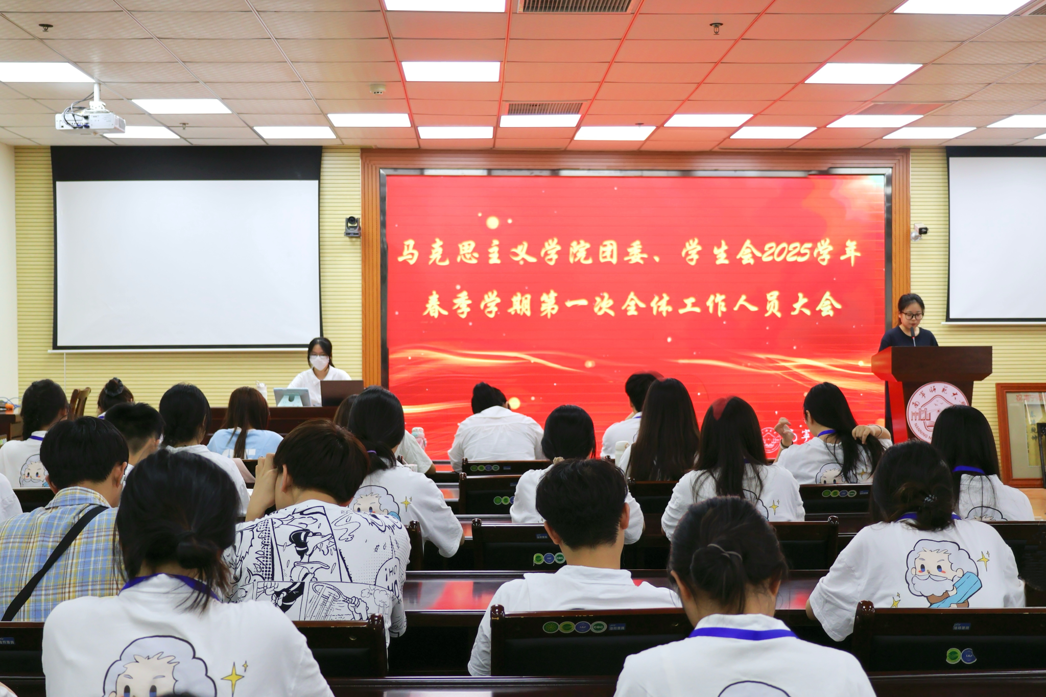 会议采用“述评结合”模式,各部门代表依次上台汇报三月份工作完成情况,在总结工作优点的同时也指出了不足和改进方法。本次会议,认真剖析活动宣传覆盖率不足、跨部门协作效率待提升等多项问题。述评结束,团委书记韦旖扬老师进行总结发言。她肯定了各部门在现阶段工作中取得的成效,重点提出三点要求:一是员工干部要筑牢政治根基,依托“青马工程”深化理论武装;二是在开展活动时要守牢安全底线,活动必须落实“一活动一预案”;三是要争当先锋表率,在遵守校规校纪、参与社会实践等环节发挥带头示范作用。